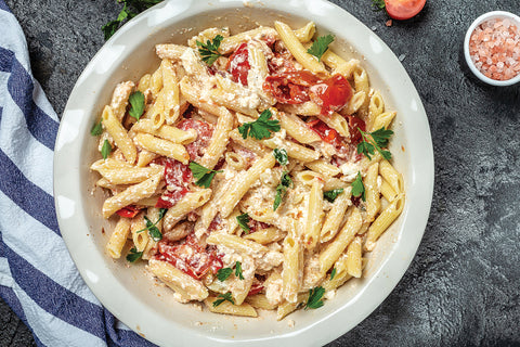 This tomato, feta, and kale penne is the perfect weeknight dinner for you and your family! Made with blistered tomatoes, fresh kale, and crumbled Mediterranean feta, this penne is a light, yet tasty meal that everyone will love (even the picky eaters)! If you’re looking for more protein, grill some chicken and add into the mix.